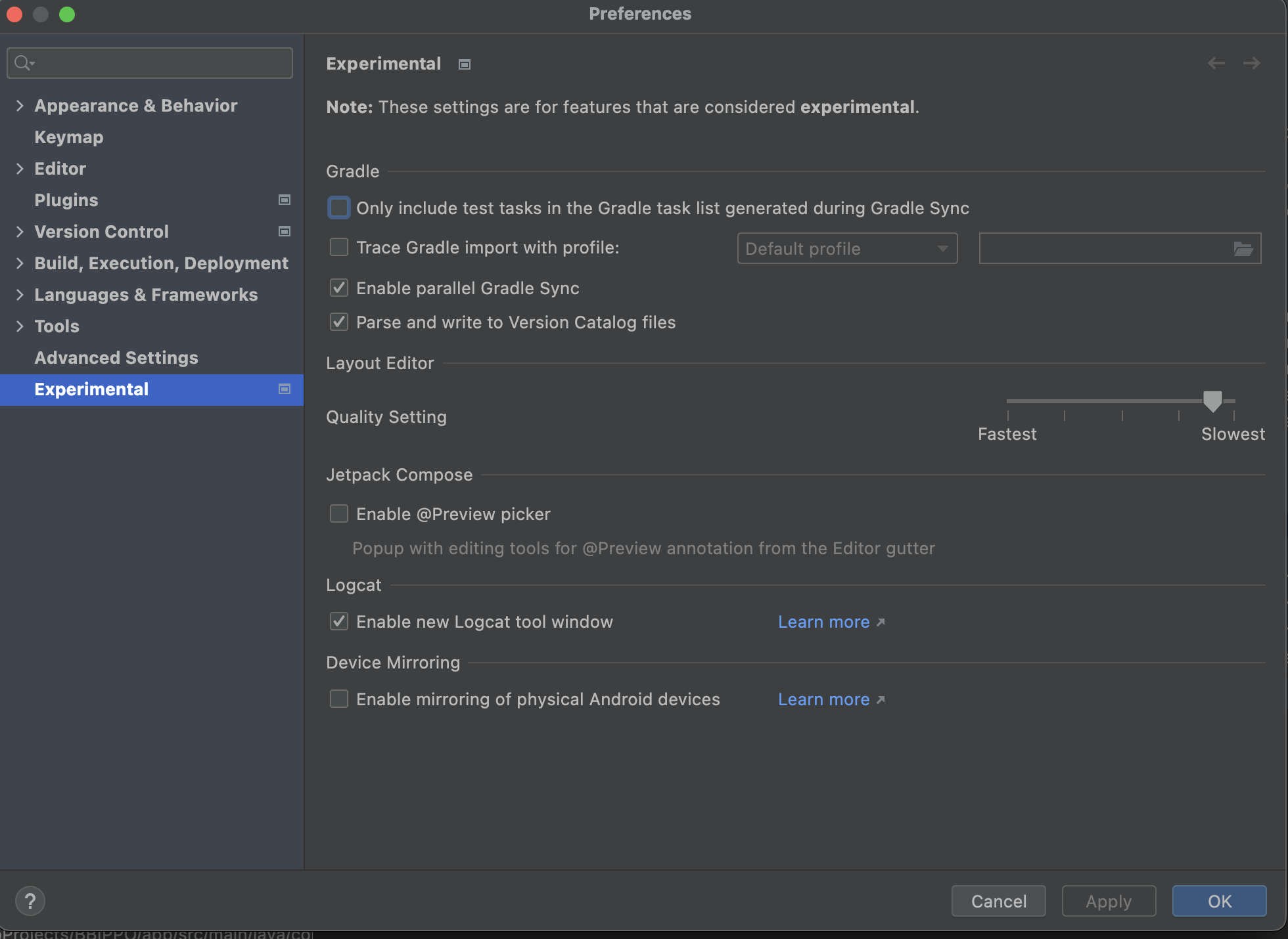 1. Android Studio > setting > Experimetal > Gradle : Only include test tasks in the Gradle task list generated during Gradle Sync uncheck